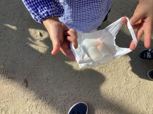 宝探しが終わったら、ペアの友だちと相談して、好きなクラスでお弁当を食べたり、見つけた宝物で遊びました。