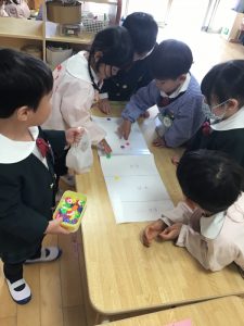 宝探しが終わったら、ペアの友だちと相談して、好きなクラスでお弁当を食べたり、見つけた宝物で遊びました。