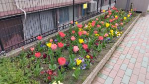 駐車場脇の花壇はチューリップとすみれがイイ感じです。