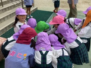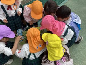 虫たちもこの気候に誘われて出てきましたようで、子どもたちは階段下などの暗い場所等を探し、ダンゴムシを見つけては職員室に