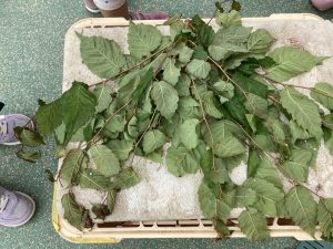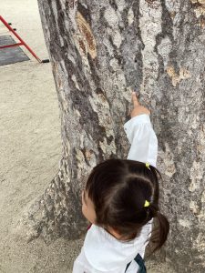 ある朝、ケヤキの枝が園庭に落ちていたのを先生が見つけ、子どもたちの目にとまるところに置いておきました。