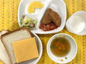 自分で作ろう!メンチカツサンド(食パン・メンチカツ・チーズ・玉ねぎのケチャップソース) ウインナー入りフレンチサラダ 南瓜とインゲンのコンソメスープ パイン缶 牛乳