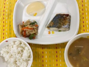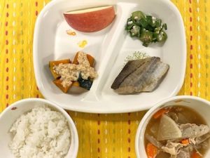 鱈のつけ焼き オクラのおかか和え 南瓜のそぼろ煮 豚汁 ごはん りんご