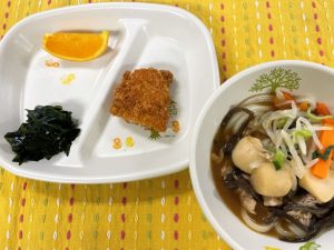 お野菜たっぷり味噌うどん 白身魚フライ ごまわかめ オレンジ